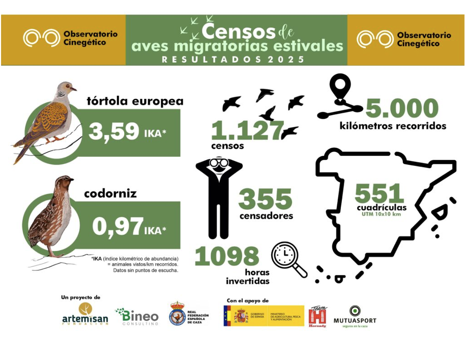 Como coto de caza federado en Aragón, nos sentimos especialmente orgullosos de formar parte de la red colaborativa liderada por Fundación Artemisan, la RFEC y las federaciones autonómicas de caza, a través del Observatorio Cinegético. Gracias a esta alianza, durante los meses de abril a julio de 2025 se alcanzó un hito: 1.127 censos válidos distribuidos por todo el territorio nacional, lo que representa un incremento del más del 26 % respecto a la campaña anterior